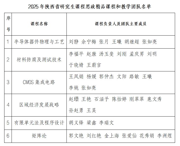 近日,陕西省教育厅印发《关于公布2025年陕西省研究生课程思政精品课程认定结果的通知》(陕教函〔2025〕1161号),beat365官网6门课程成功获批陕西省研究生课程思政精品课程和教学团队,覆盖工学、理学、人文社科等多个学科门类,呈现出学科分布均衡、交叉融合特征鲜明的良好格局。