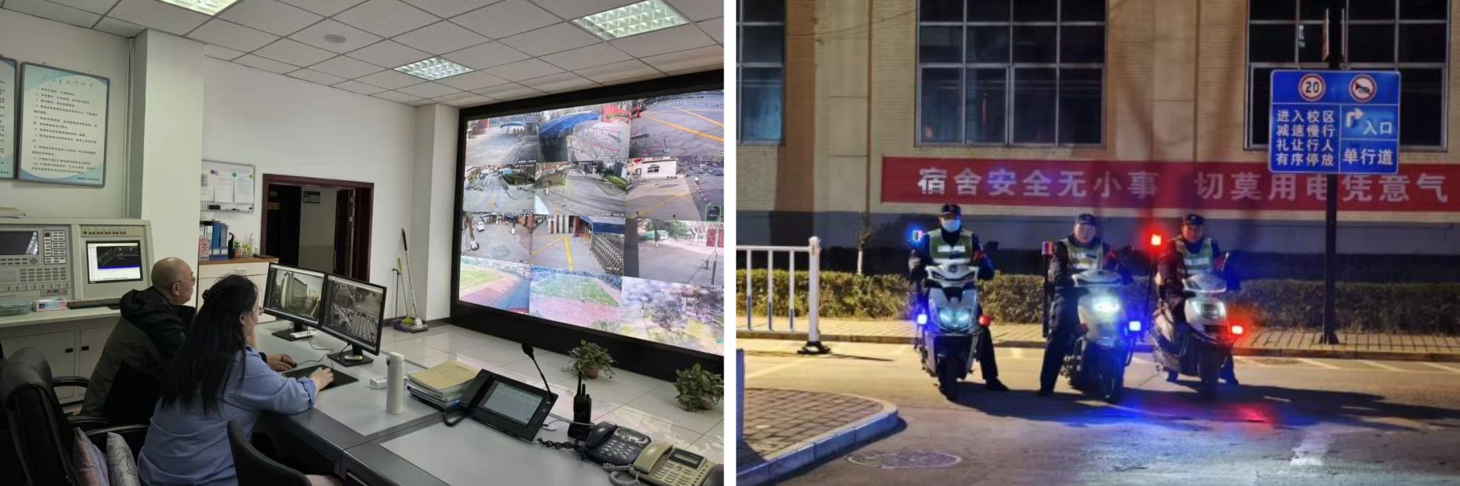 校园安全防线牢固构筑,各校区门岗严把校园“入口关”,巡逻队员加密重点区域巡查频次,对教学楼、学生宿舍等关键部位开展全天候巡逻,细致排查安全隐患、及时消除安全风险。监控中心实时巡查校园全域,实现人防、物防、技防深度融合,确保异常情况早发现、早预警、早处置。