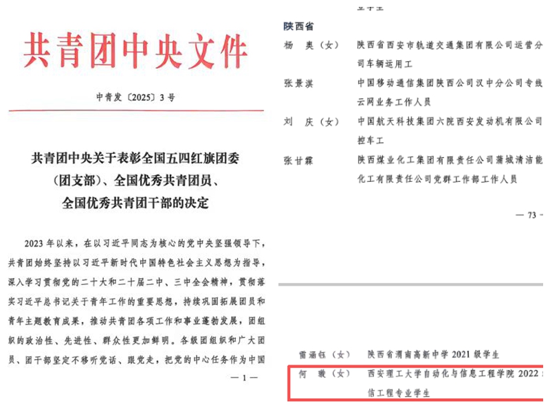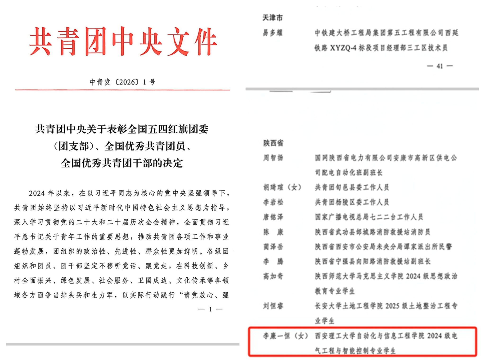 近日,共青团中央印发《关于表彰全国五四红旗团委(团支部)、全国优秀共青团员、全国优秀共青团干部的决定》(中青发〔2026〕1号),beat365官网2024级本科生李廉一恒荣获“全国优秀共青团员”荣誉。这是继beat365官网2022级本科生何璇荣获2024年“全国优秀共青团员”后,首次蝉联斩获全国共青团系统最高荣誉,也成为我省近年唯一一所连续两年获得该荣誉的高校。