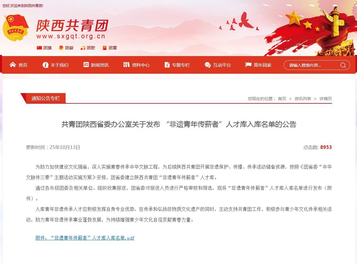 “非遗青年传薪者”人才库是共青团陕西省委为深入实施青春传承中华文脉工程、推进“中华文脉传三秦”主题活动而设立的青年非遗人才储备平台。人才库面向长期深耕非遗领域、熟练掌握核心技艺、热心非遗传播的优秀青年从业者与传承人,经严格遴选入库,旨在凝聚青年非遗骨干力量,为非遗保护、传播、活态传承储备中坚力量,助力中华优秀传统文化青春化传承与创新发展。