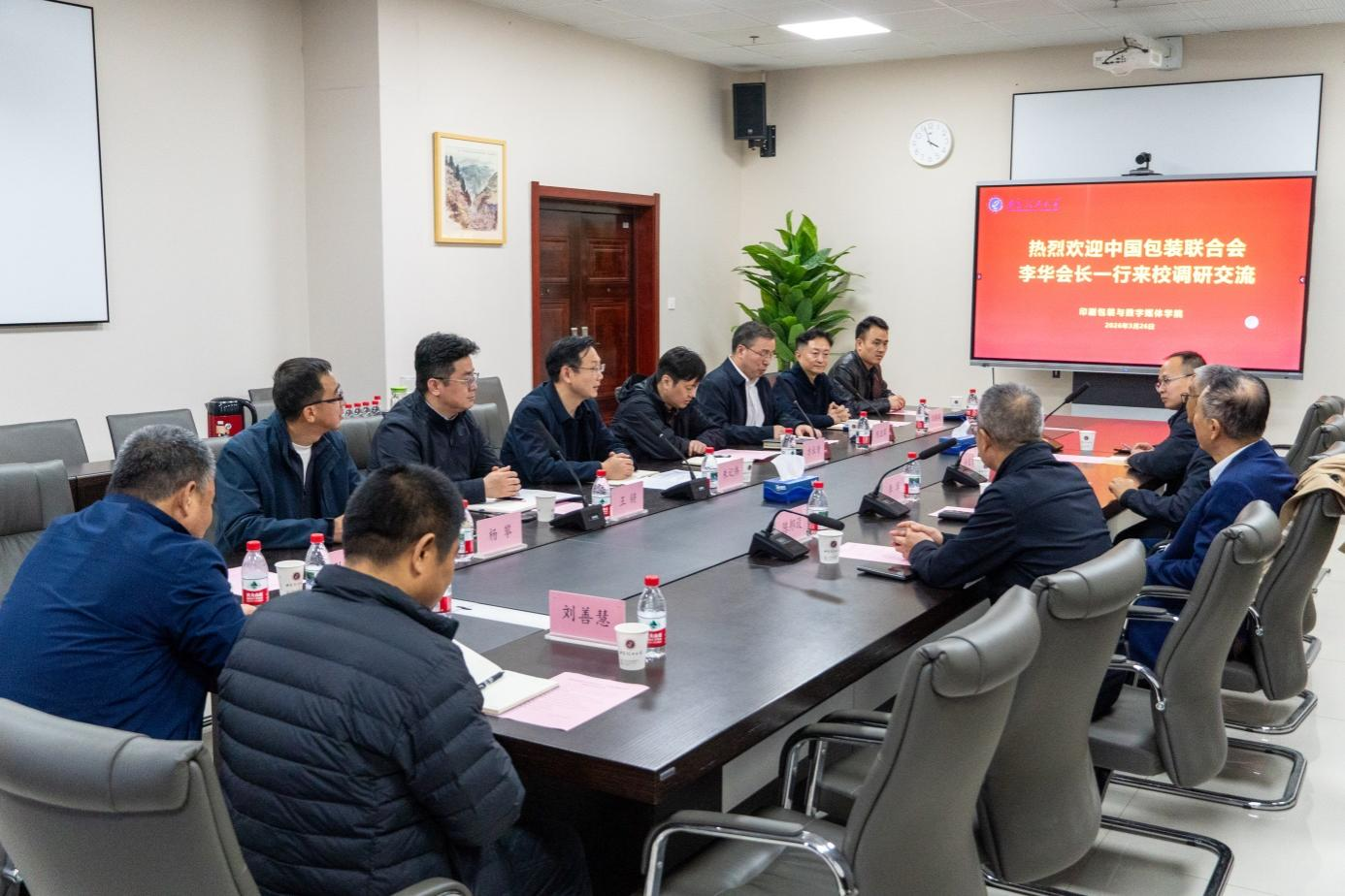 3月26日下午,中国包装联合会会长李华一行来beat365官网调研交流。校党委书记李智军,省纪委监委驻校纪检监察组组长、校党委副书记、纪委书记李鹏在金花校区第一接待室会见来宾,副校长朱记伟参加座谈会并致辞。
