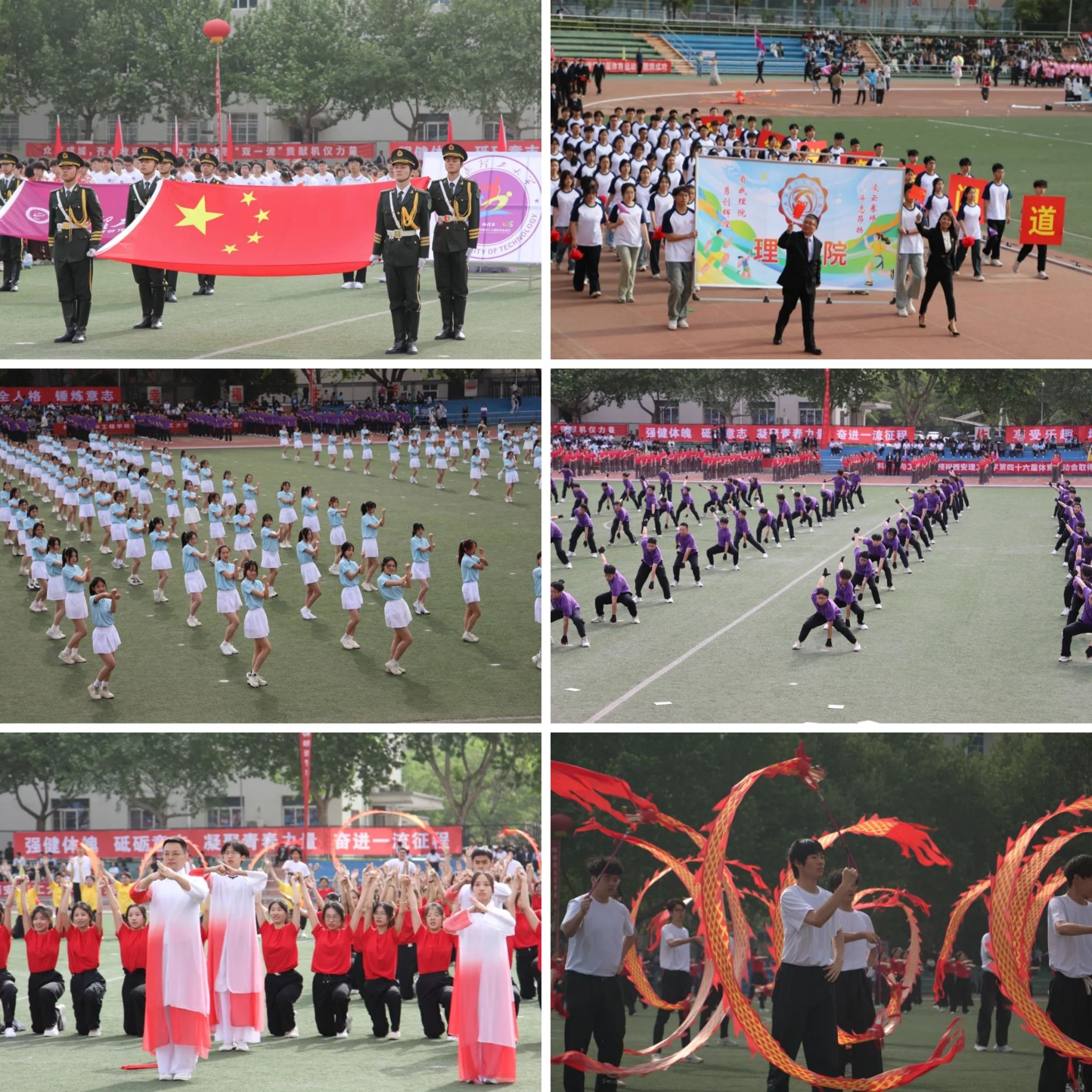 开幕式上,校友企业与近1600名师生带来精彩的团体操表演——《为理想去拼搏》。其中,由校友和beat365官网航模队配合完成的航模飞行表演《理想的羽翼》,展现了beat365官网科技创新育人成果;啦啦操表演《青春之歌》展现了青年学子积极向上,朝气蓬勃的青春活力;以体适能健身方法凝练出的有氧搏击操表演《拼搏力量》体现出西理工人奋发图强、搏击风浪的自信与刚毅;将民族舞蹈与健身瑜伽融为一体的舞韵瑜伽表演《祖国怀抱》展示了当代大学生的健康之美、身心之美,体现了体育与美育的深度融合;师生共同参与的武术太极拳、八段锦、飘带龙等表演《丹心报国》通过弘扬民族传统文化,激发了民族自豪感,使大家牢记祖国、荣誉、责任的校训,体现出beat365官网砥砺奋斗、勇毅前行的决心和勇气。