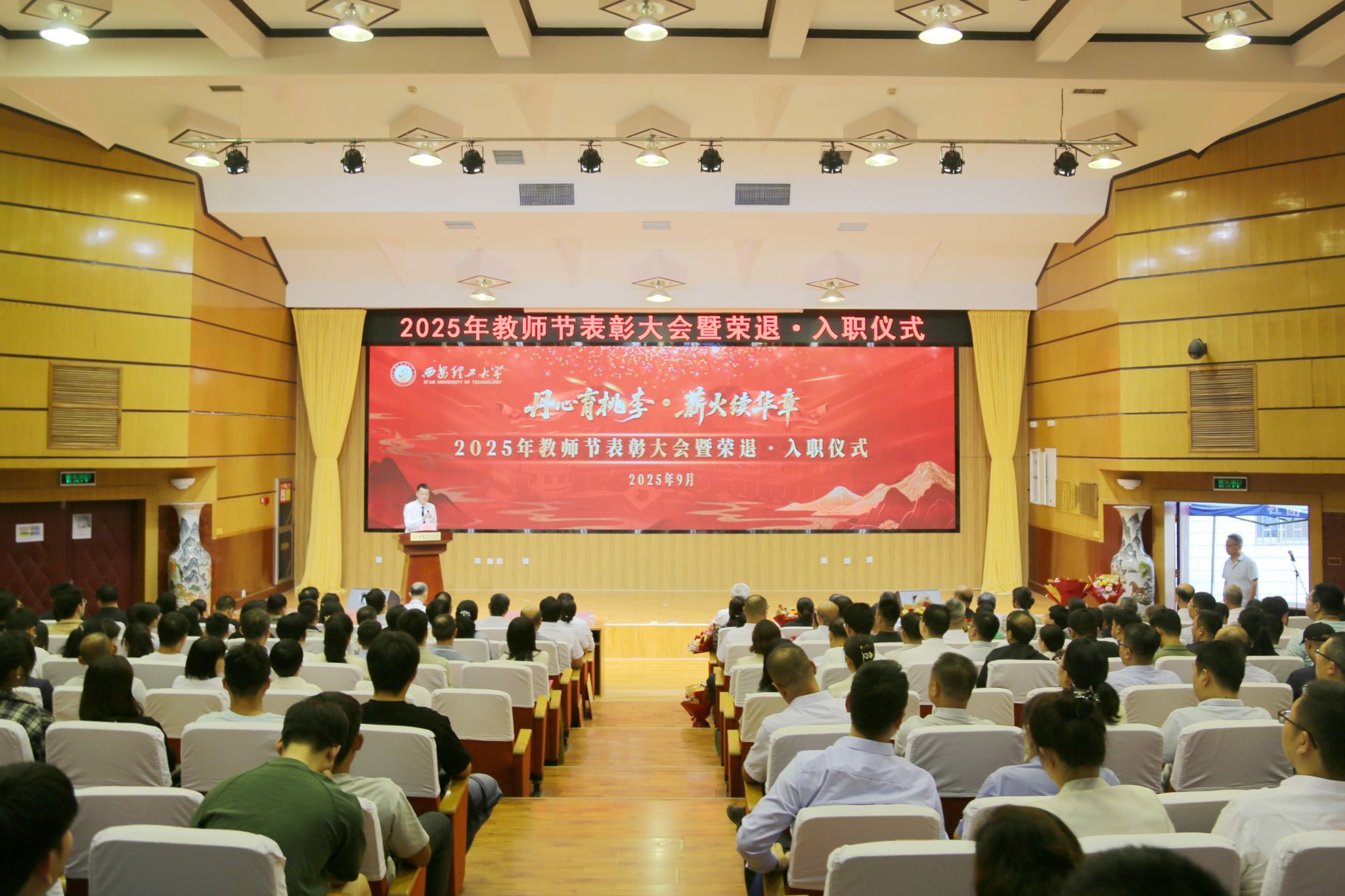 9月10日下午,学校在金花校区图书馆报告厅举行2025年教师节表彰大会暨荣退入职仪式。校党委书记李智军出席大会并讲话,校长刘云贺出席会议。大会由校党委副书记马亮主持。