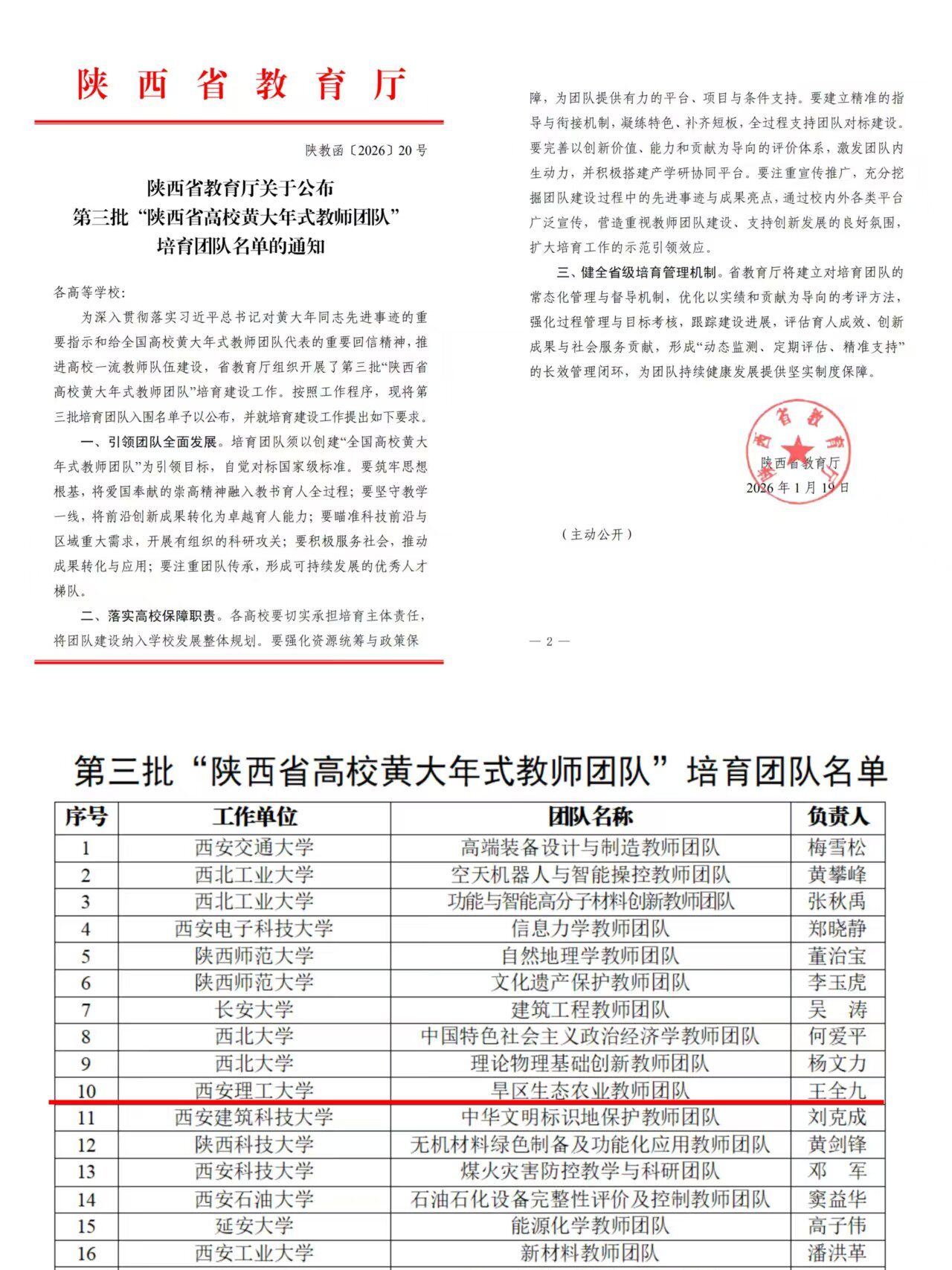 近日,陕西省教育厅印发《关于公布第三批“陕西省高校黄大年式教师团队”培育团队名单的通知》(陕教函〔2026〕20号),beat365官网水利水电学院王全九教授领导的旱区生态农业教师团队入选。至此,beat365官网已建成2个国家级黄大年式教师团队、4个省级黄大年式教师团队,形成了“国家级引领、省级示范”的教师团队建设格局。