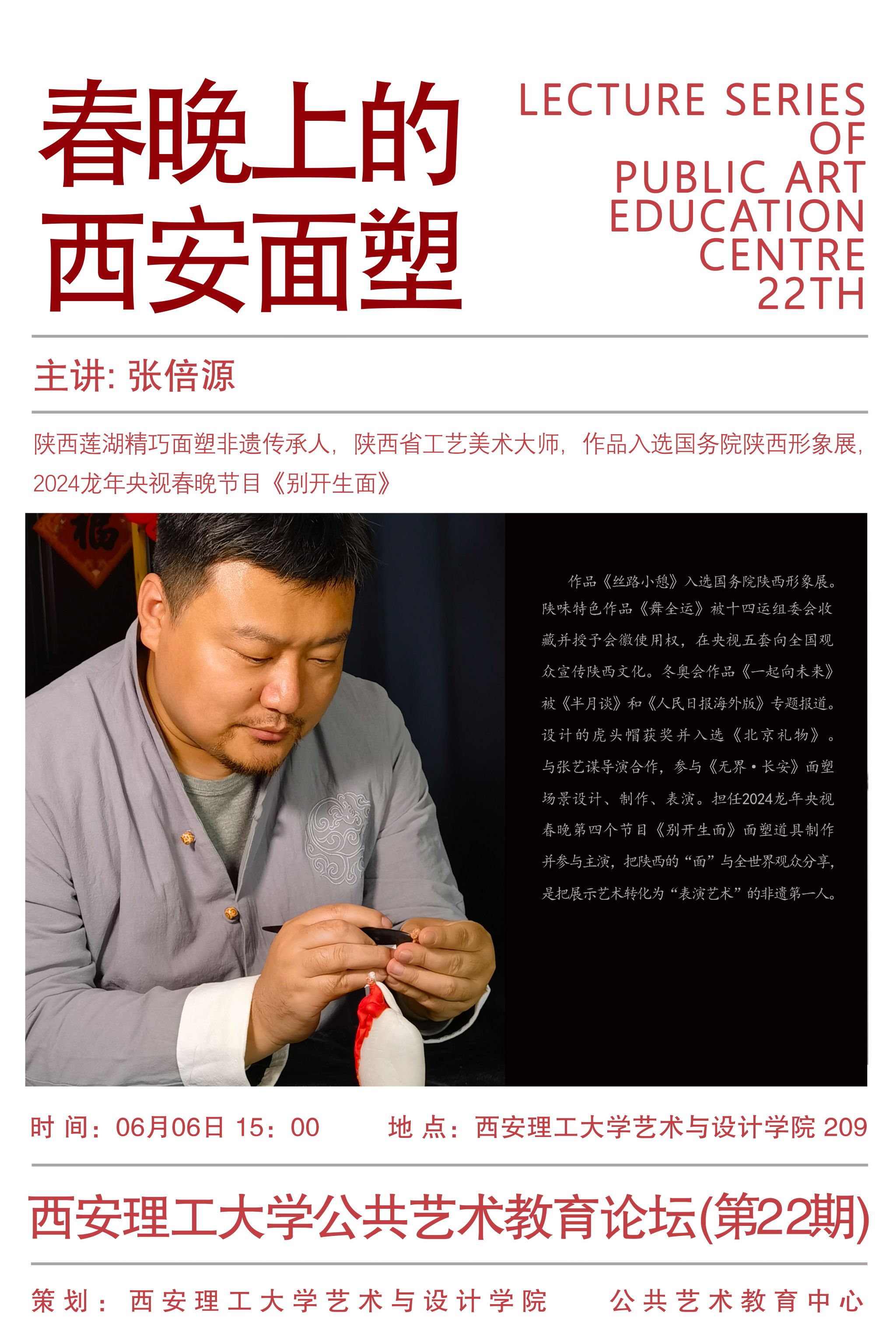 主讲人:张倍源 陕西莲湖精巧面塑非遗传承人,陕西省工艺美术大师,作品入选国务院陕西形象展,2024龙年央视春晚节目《别开生面》