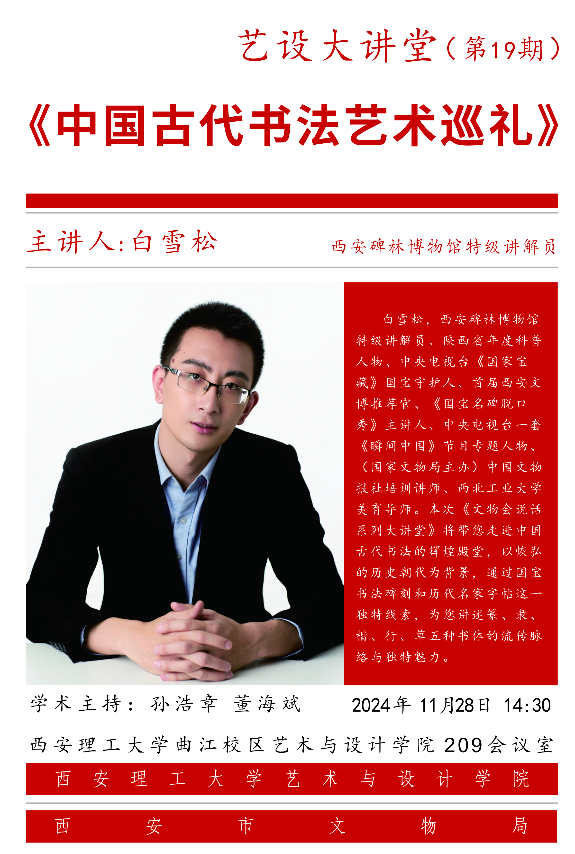 讲座人简介:白雪松,西安碑林博物馆特级讲解员、陕西省年度科普人物、中央电视台《国家宝藏》国宝守护人、首届西安文博推荐官、《国宝名碑脱口秀》主讲人、中央电视台一套《瞬间中国》节目专题人物、(国家文物局主办)中国文物报社培训讲师、西北工业大学美育导师。
