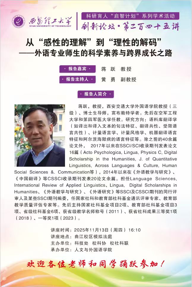 创新论坛第245讲:【人文雅韵】西安交通大学蒋跃教授学术报告通知