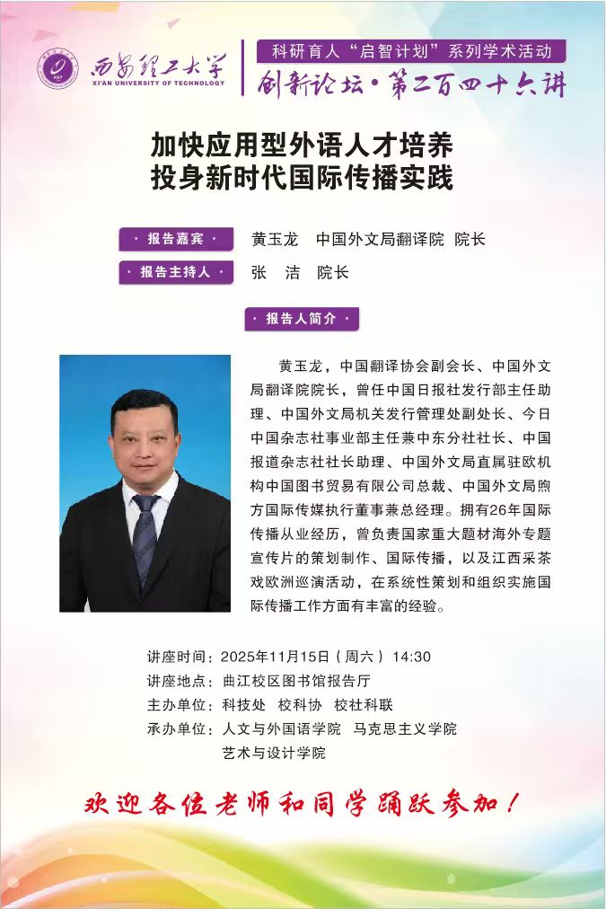 创新论坛第246讲:【人文雅韵】中国外文局翻译院院长黄玉龙学术报告通知