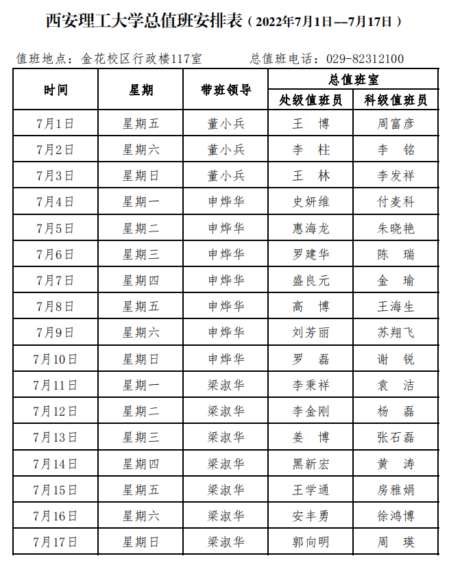 beat365正版唯一官网必一总值班安排表(2022年7月1日--7月17日)