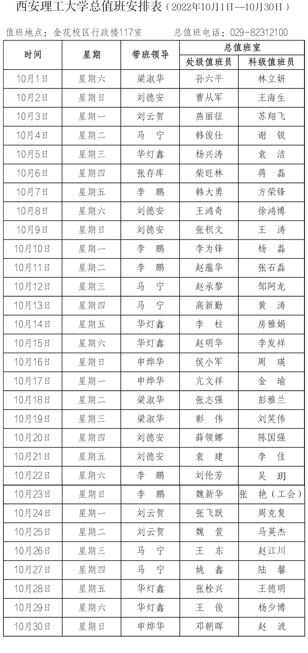 beat365正版唯一官网必一总值班安排表(2022年10月1日--10月30日)