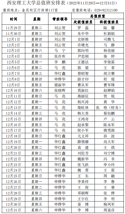 beat365正版唯一官网必一总值班安排表(2022年11月29日——12月31日)