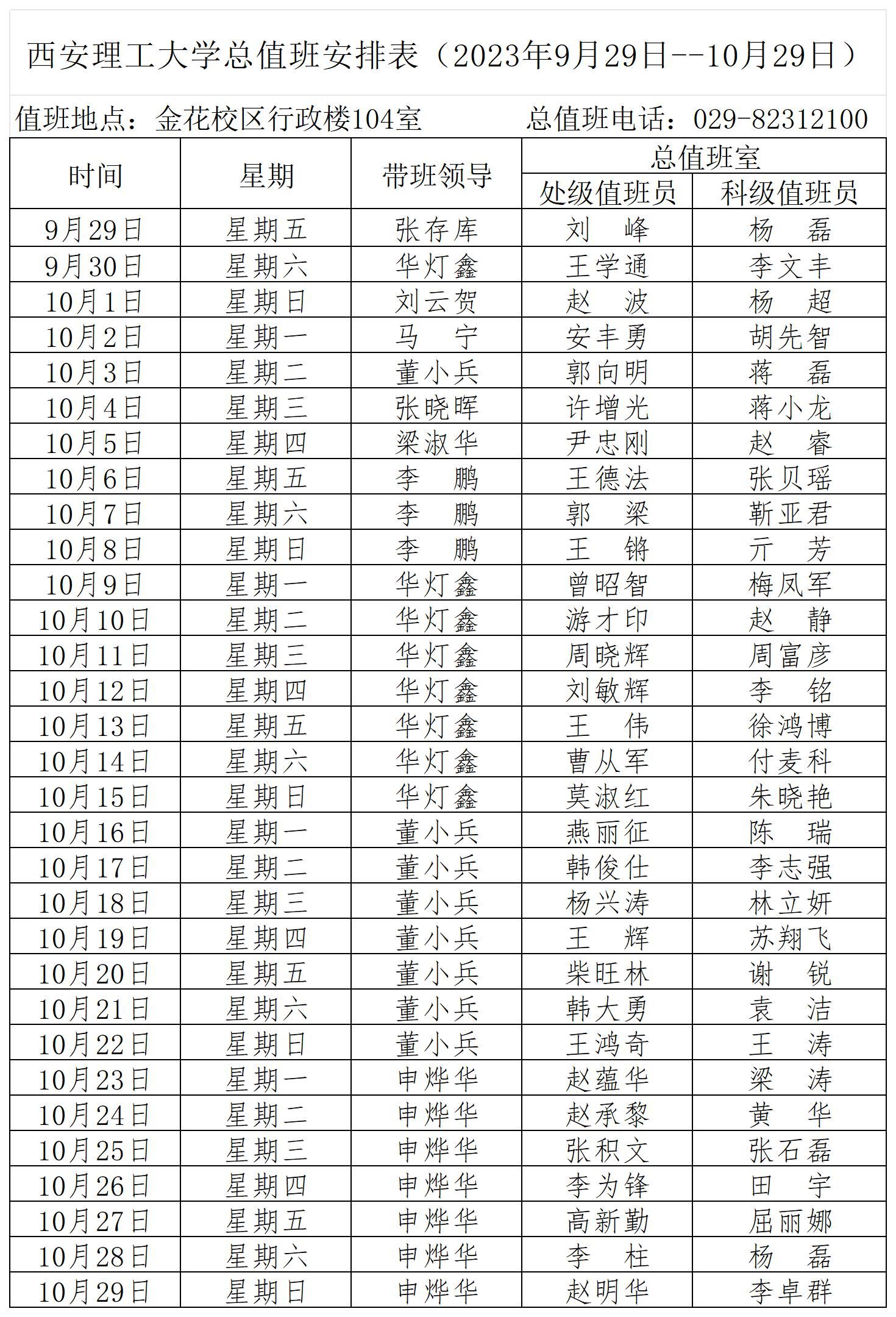 beat365正版唯一官网必一总值班安排表(2023年9月29日--10月29日)