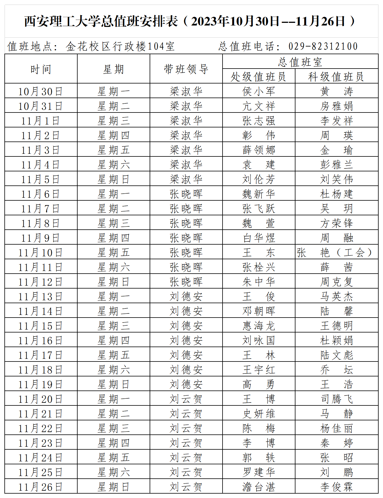 beat365正版唯一官网必一总值班安排表(2023年10月30日--11月26日)