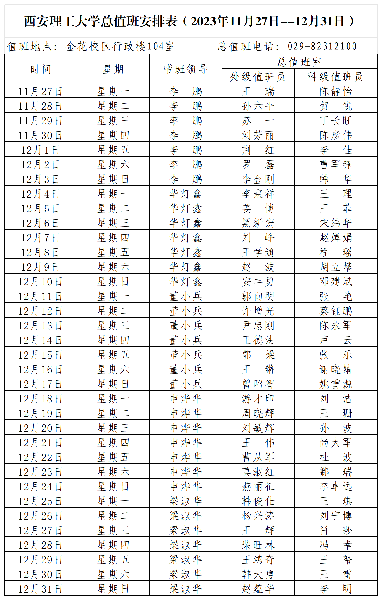 beat365正版唯一官网必一总值班安排表(2023年11月27日--12月31日)
