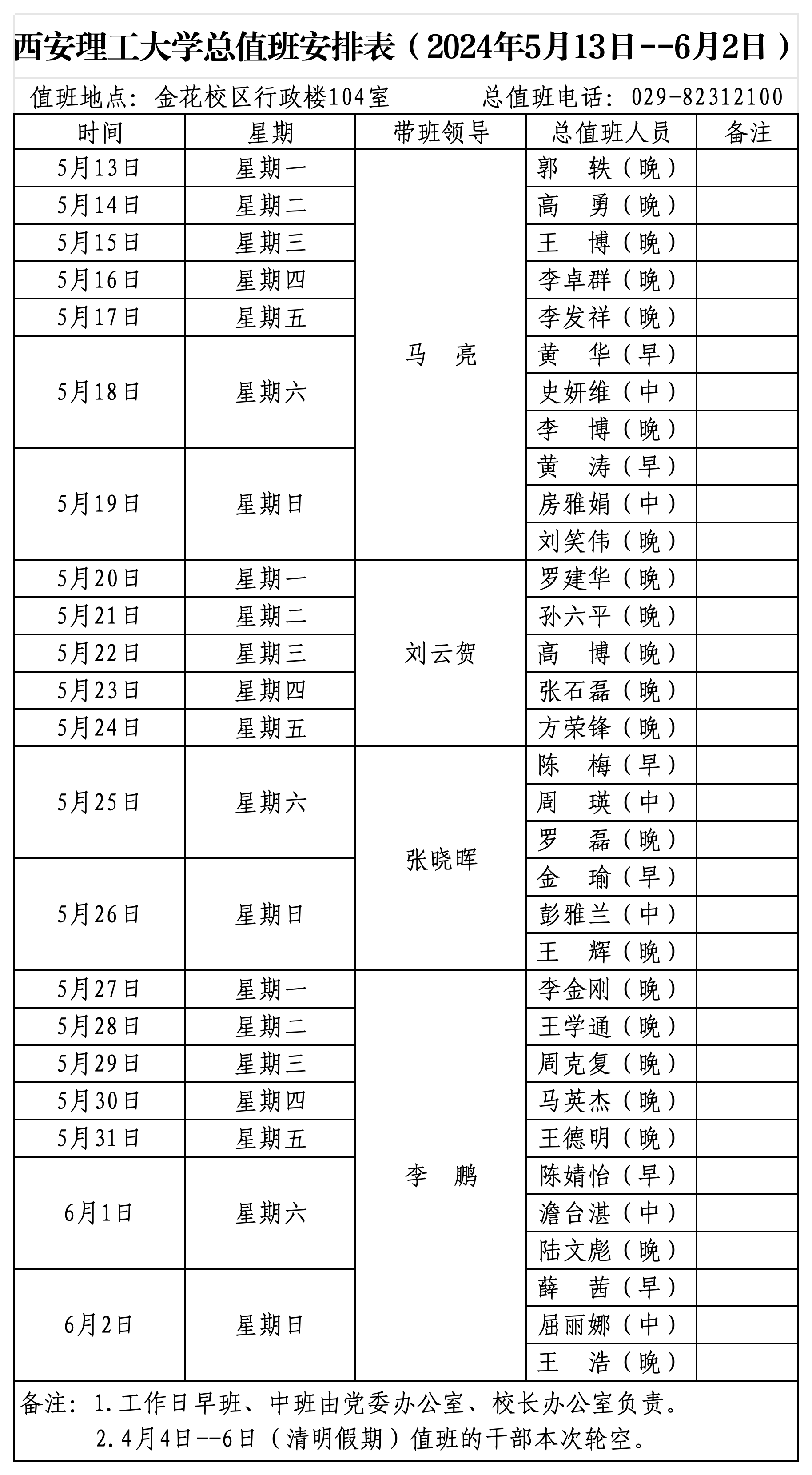 beat365正版唯一官网必一总值班安排表(2024年5月13日--6月2日)
