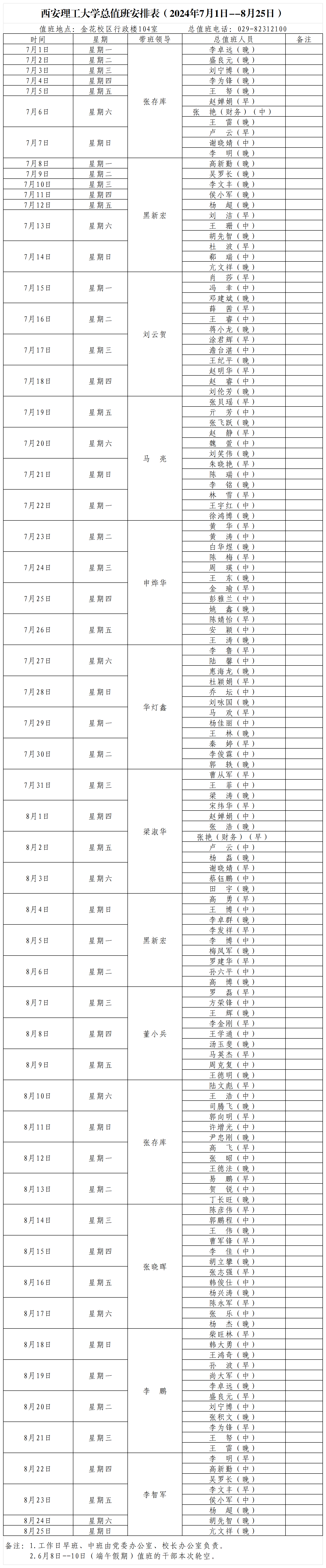 beat365正版唯一官网必一总值班安排表(2024年7月1日--8月25日)