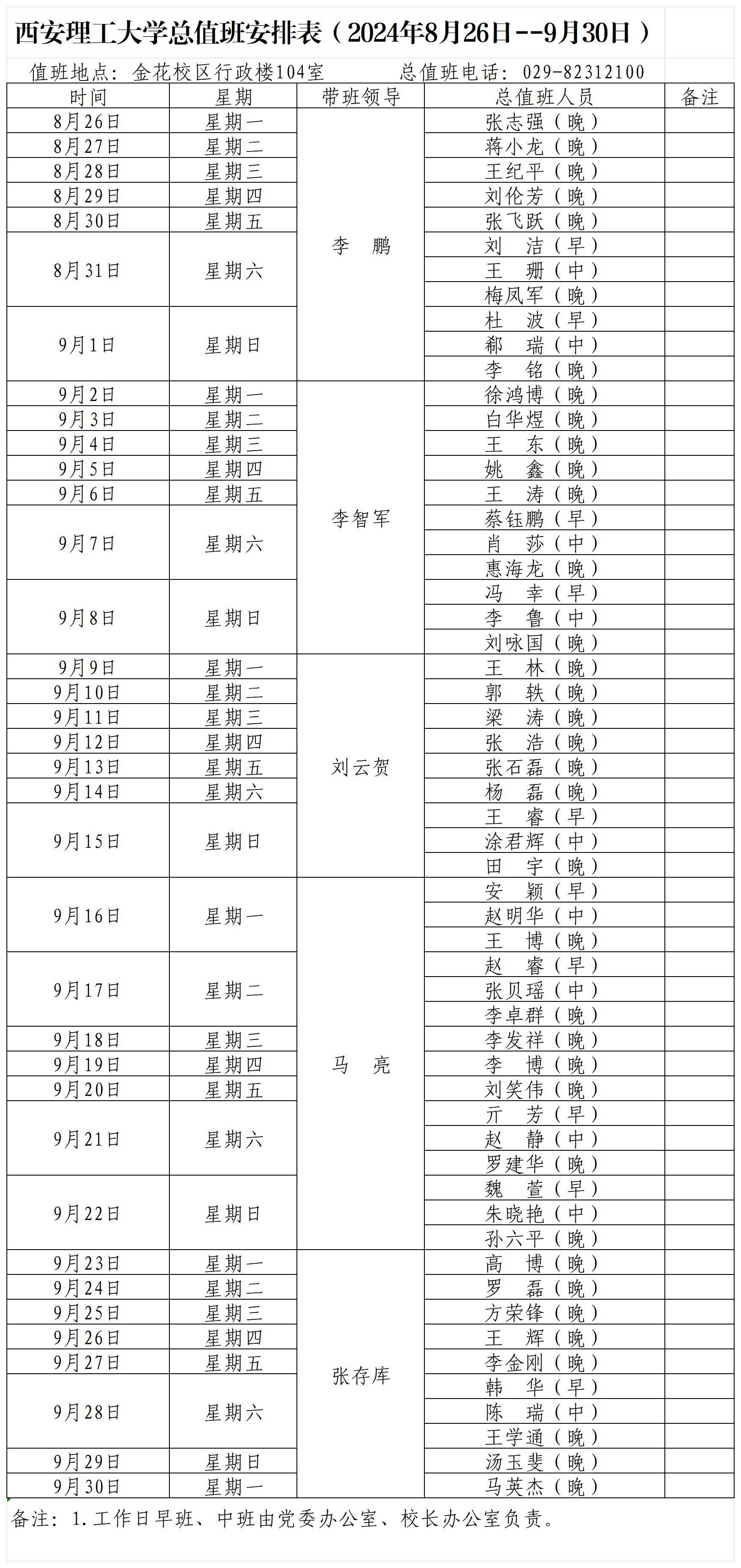 beat365正版唯一官网必一总值班安排表(2024年8月26日--9月30日)