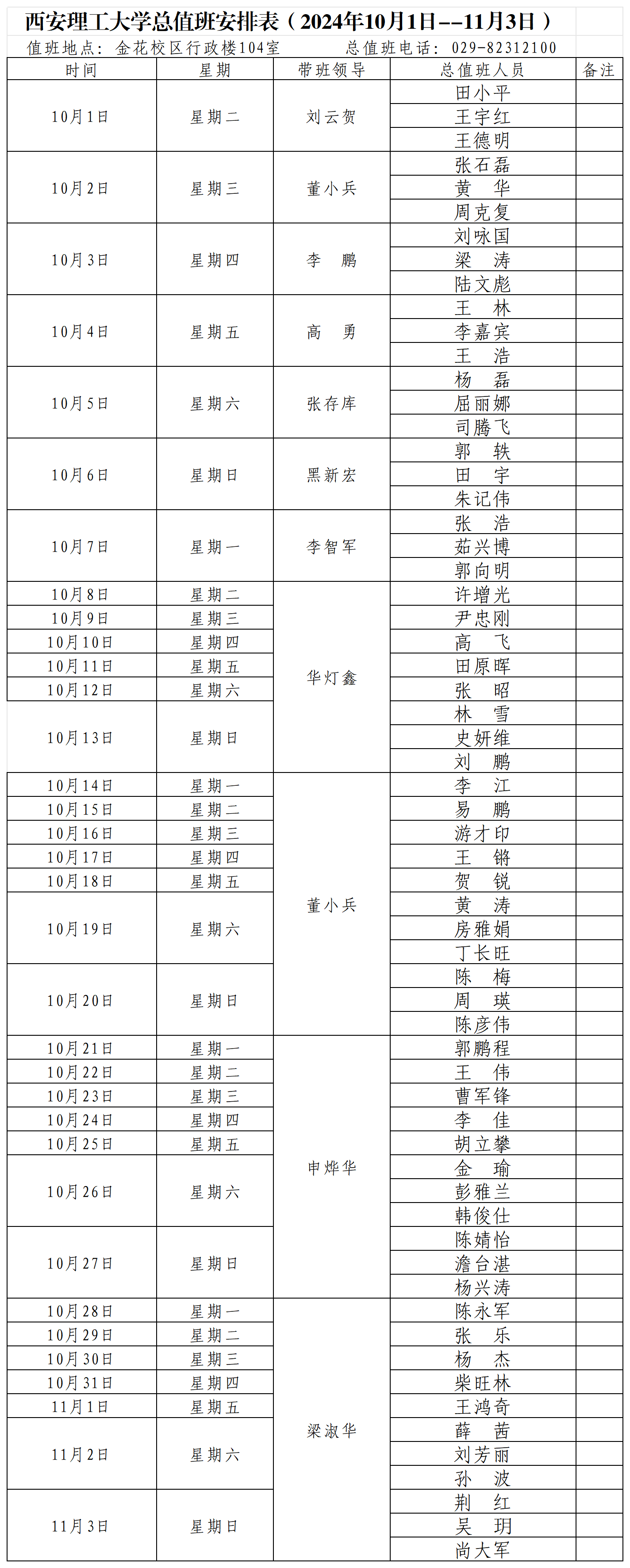 beat365正版唯一官网必一总值班安排表(2024年10月1日--11月3日)