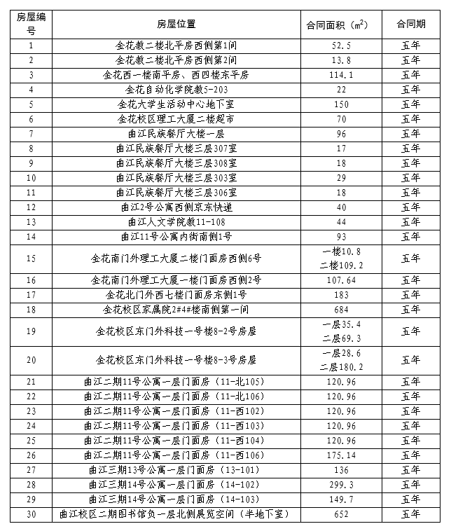 2. 招租房屋情况:本次招租共30套房屋,详见下表。