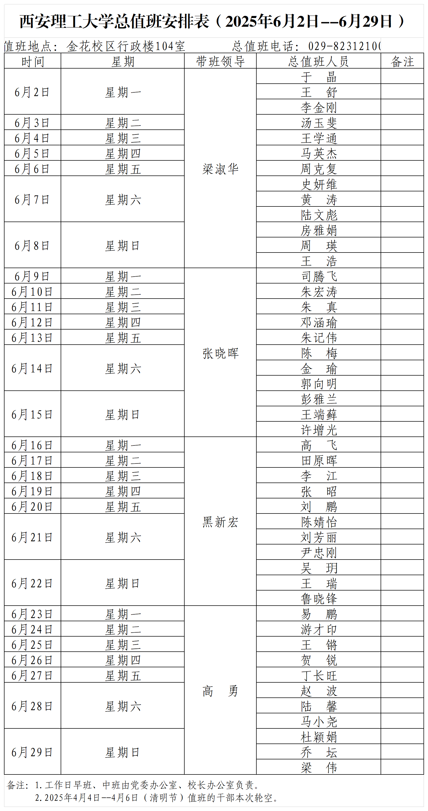 beat365正版唯一官网必一总值班安排表(2025年6月2日——6月29日)