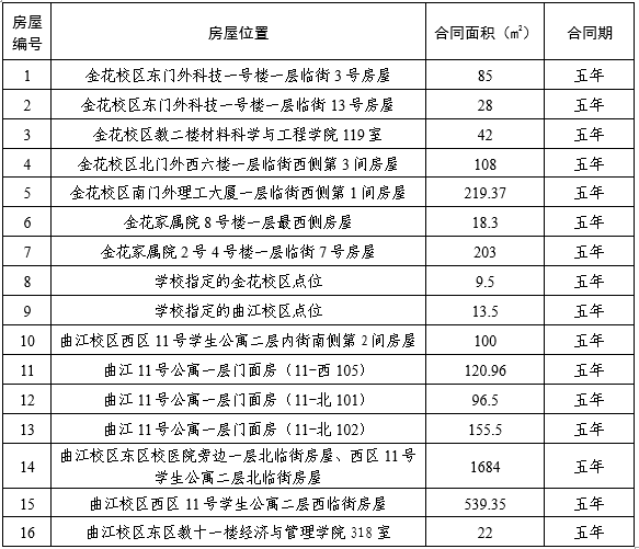 2. 招租房屋情况:本次招租共16处房屋(场地),详见下表。