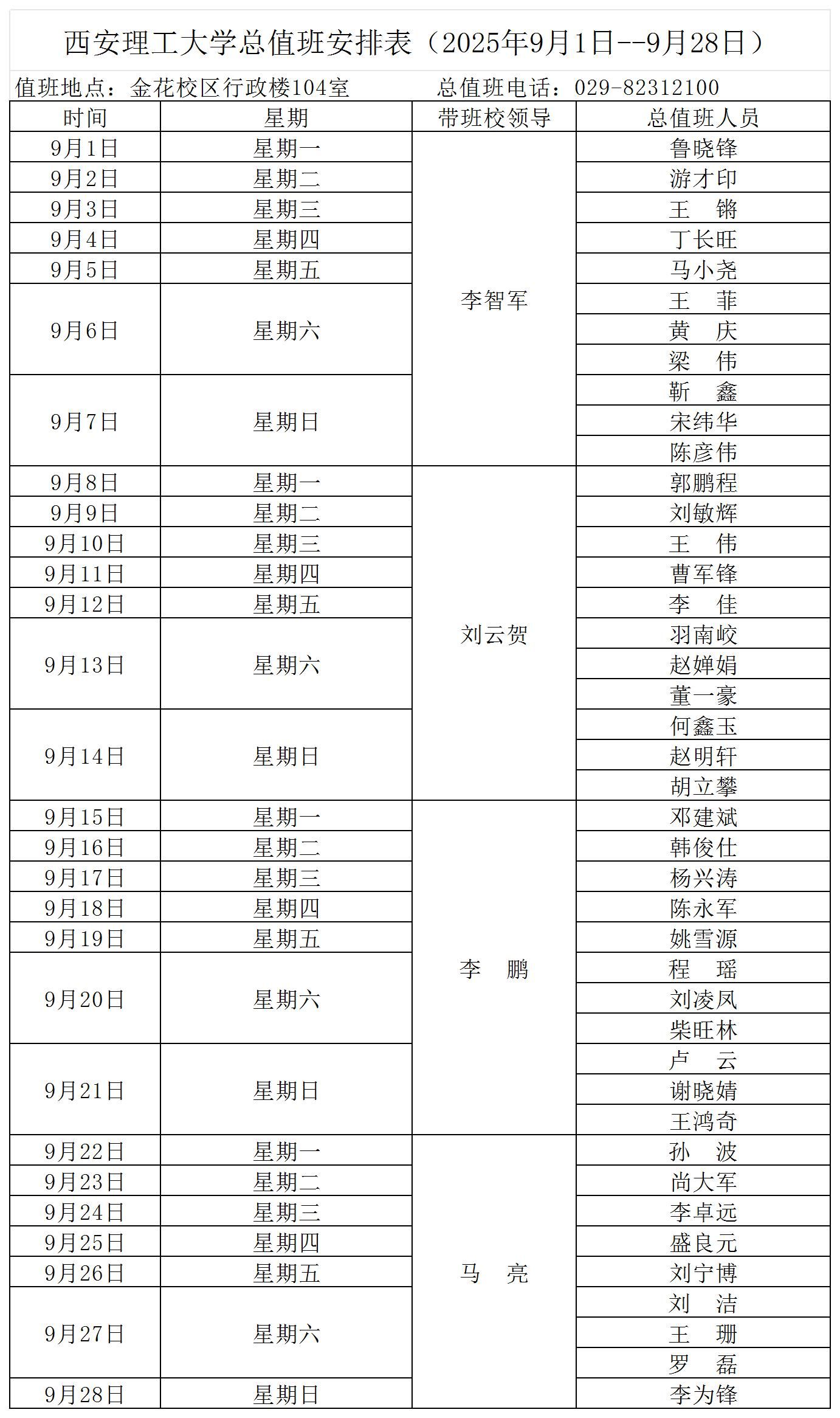 beat365正版唯一官网必一总值班安排表(2025年9月1日--9月28日)