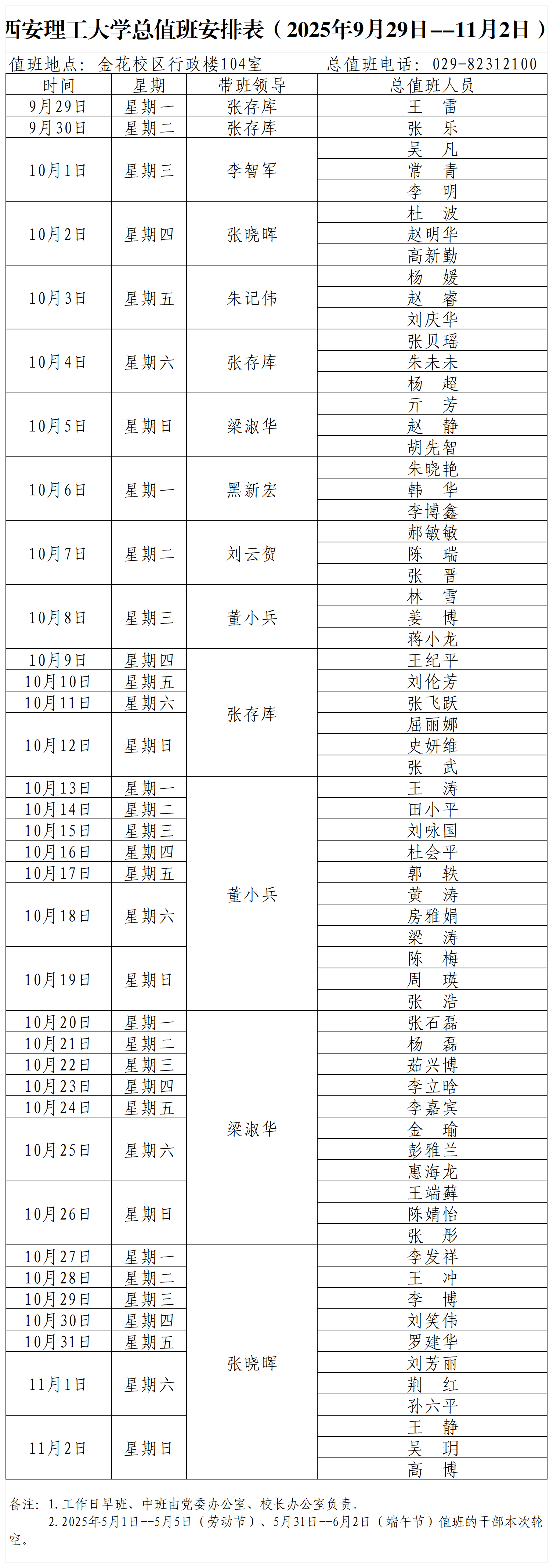 beat365正版唯一官网必一总值班安排表(2025年9月29日--11月2日)