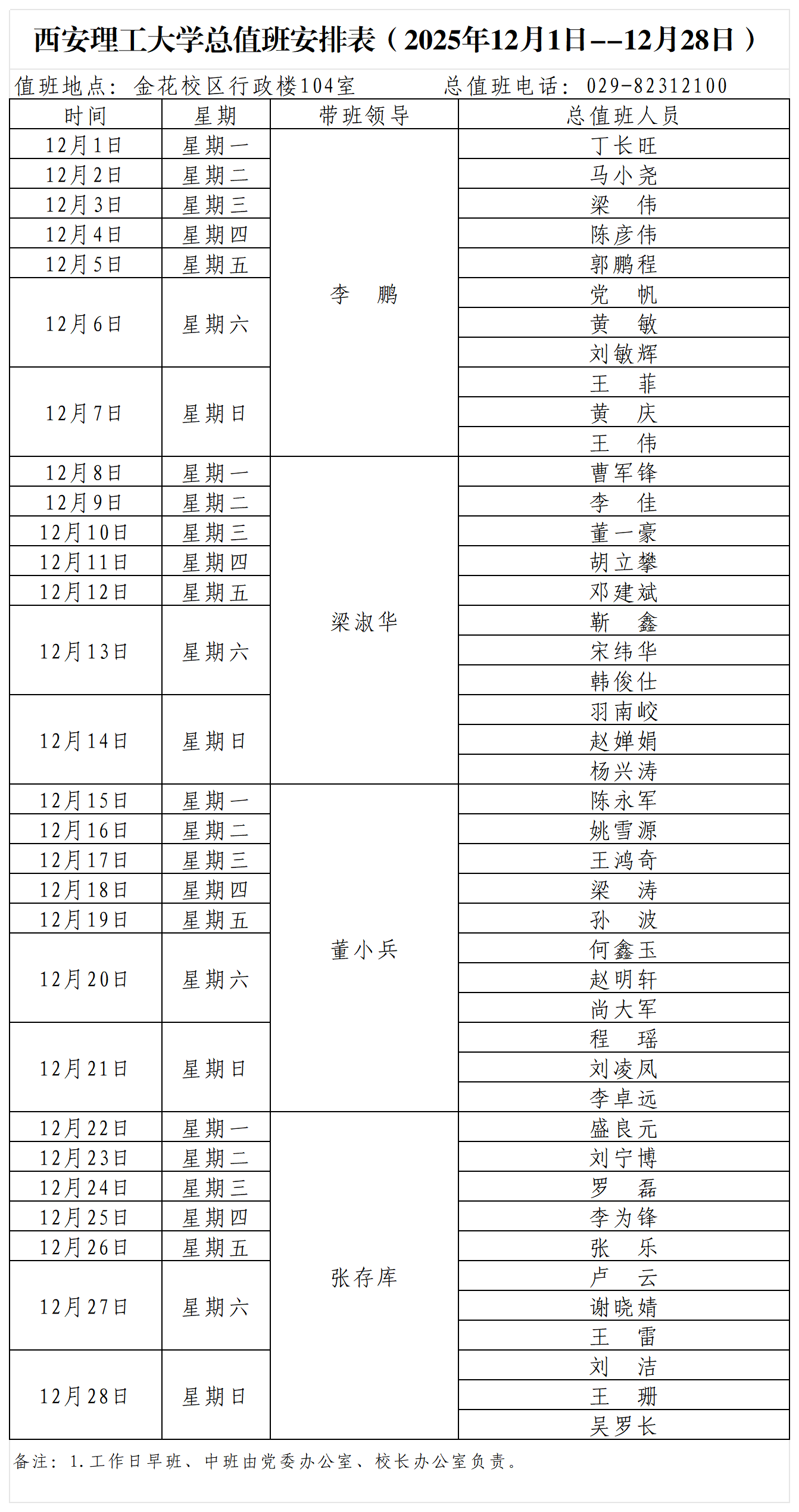 beat365正版唯一官网必一总值班安排表(2025年12月1日--12月28日)