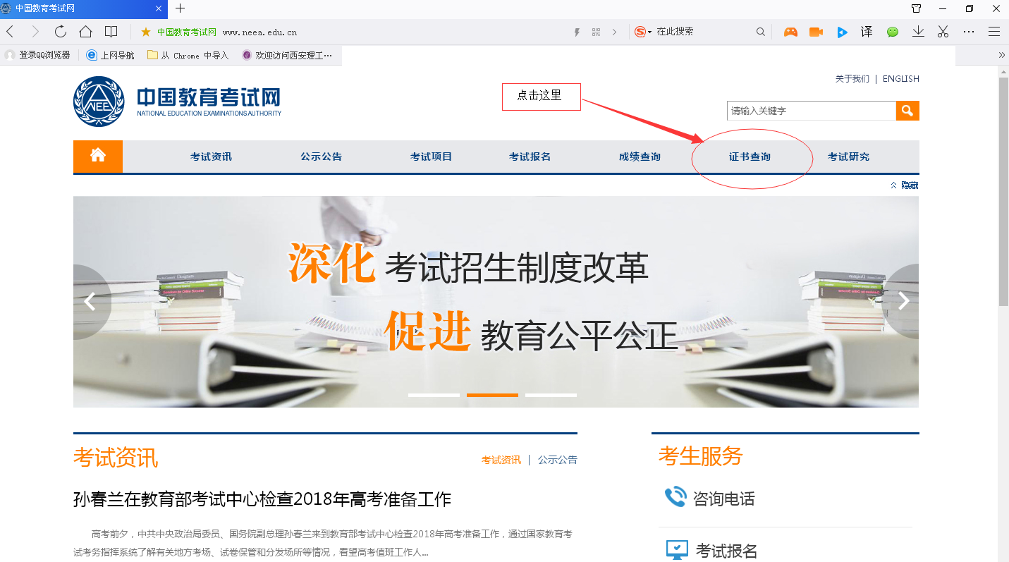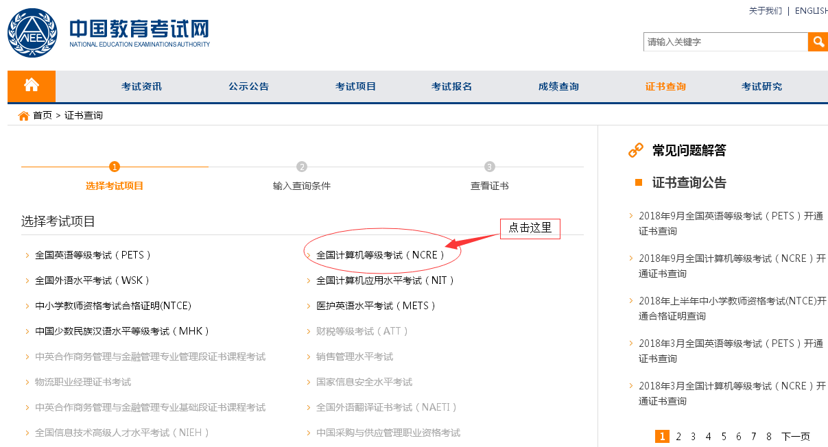 第一步:登录中国教育考试信息网http://www.neea.edu.cn/,点击【证书查询】