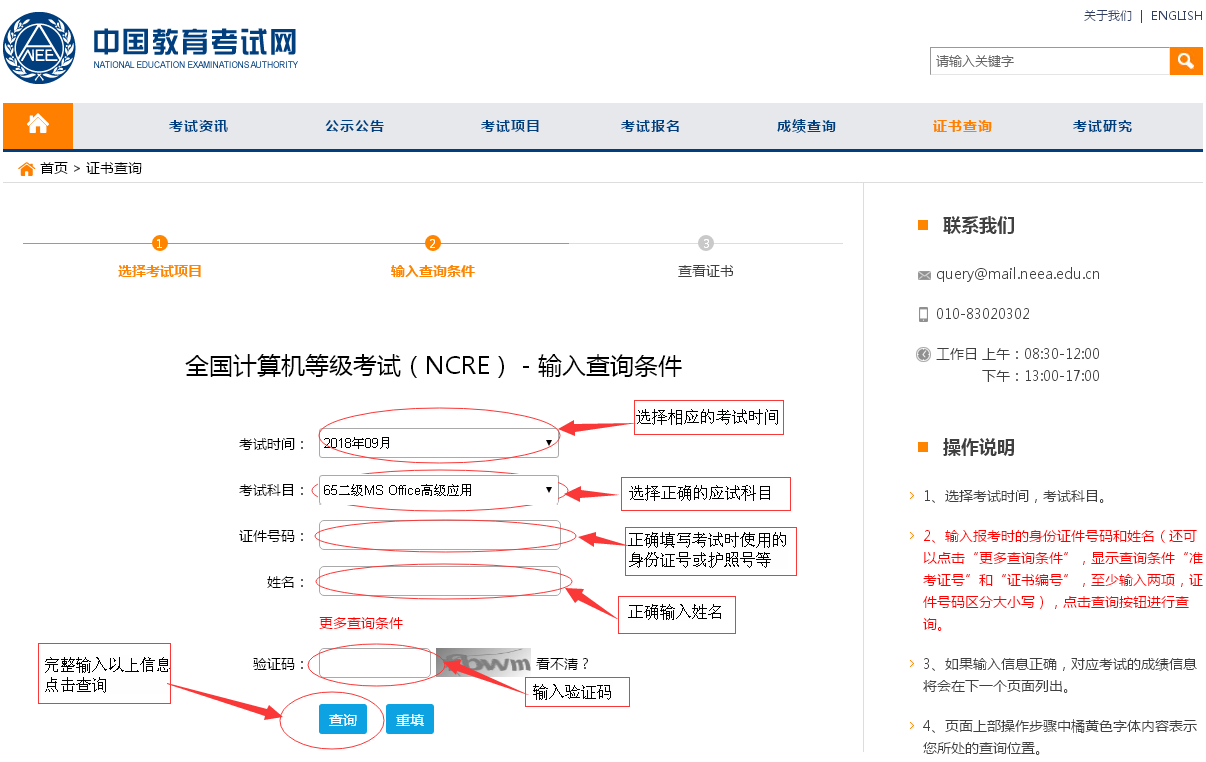 相关成绩及证书编号查询通过中国教育考试网http://www.neea.edu.cn/ (提供身份证号、姓名)进行查询。后附查询方法。