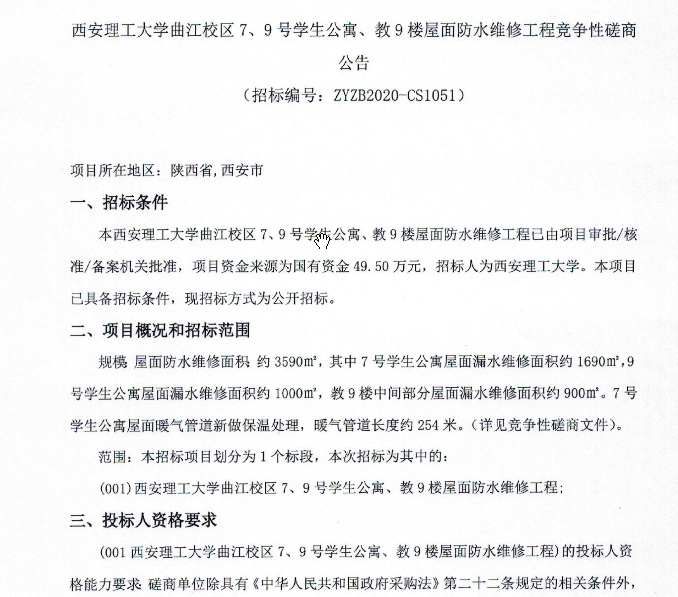 【防水维修】beat365正版唯一官网必一曲江校区7、9号学生公寓、教9楼屋面防水维修工程竞争性磋商公告