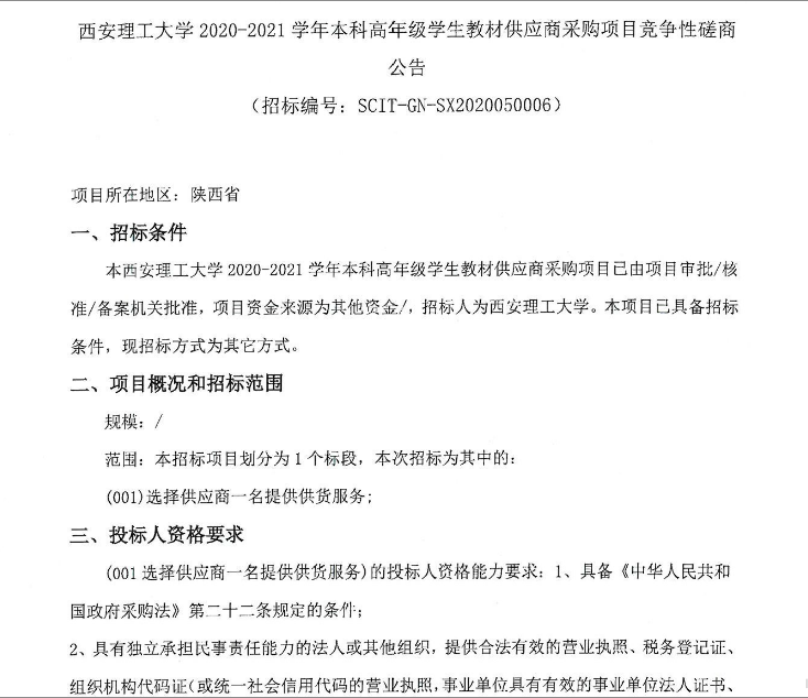 【教材】beat365正版唯一官网必一2020-2021学年2020级新生教材供应项目竞争性磋商公告