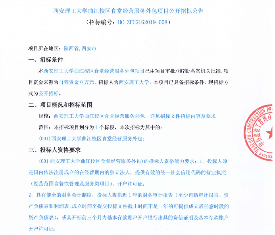【食堂经营服务】beat365正版唯一官网必一曲江校区食堂经营服务外包项目公开招标公告