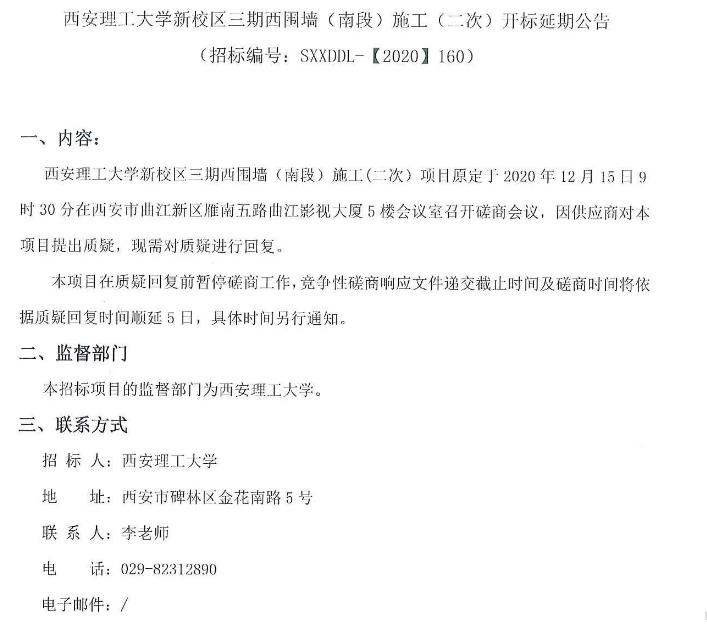 【围墙延期】beat365正版唯一官网必一新校区三期西围墙(南段)施工(二次)开标延期公告