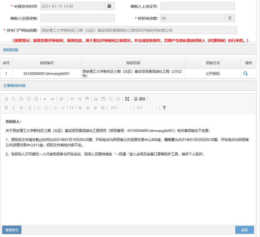 附:陕西省公共资源交易中心申请变更项目时间和地点的截图