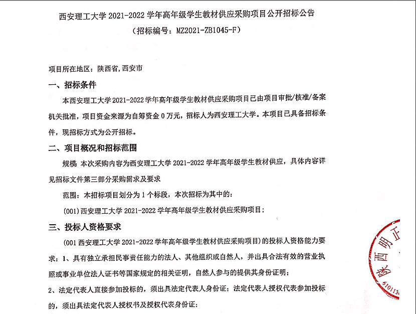 【教材供应】beat365正版唯一官网必一2021-2022学年2021级新生教材供应采购项目公开招标公告