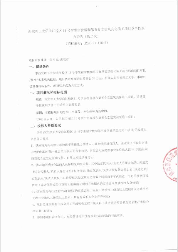 【亮化工程二次】beat365正版唯一官网必一曲江校区11号学生宿舍楼和第五食堂建筑亮化施工项目竞争性谈判公告(第二次)