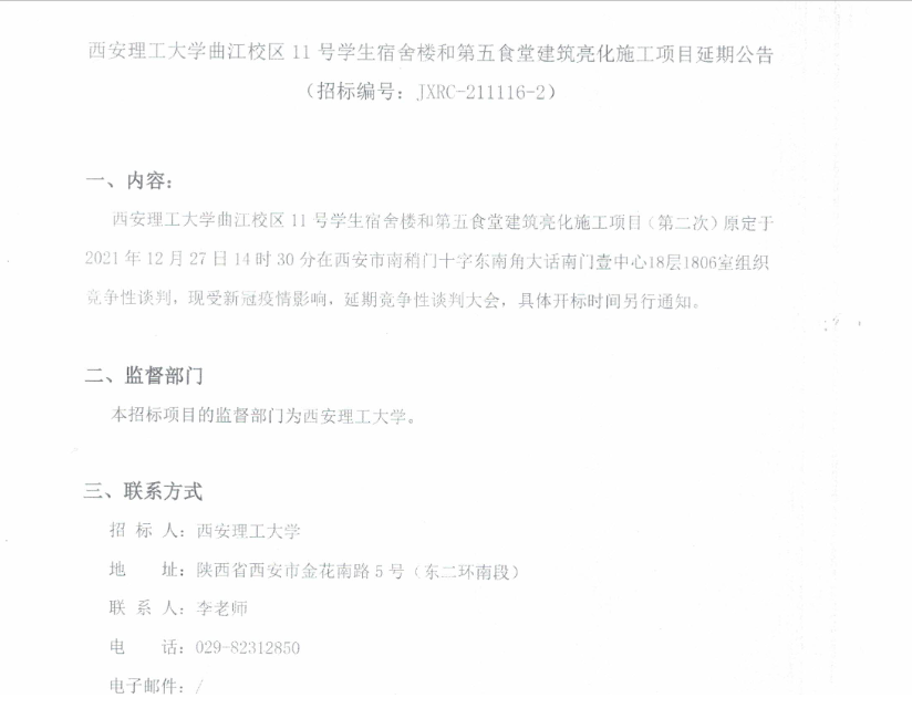 【延期公告】beat365正版唯一官网必一曲江校区11号学生宿舍楼和第五食堂建筑亮化施工项目延期公告