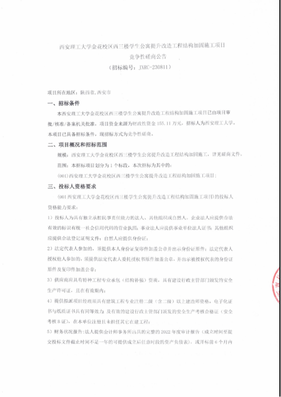 【提升改造工程】beat365正版唯一官网必一金花校区西三楼学生公寓提升改造工程结构加固施工项目竞争性磋商公告