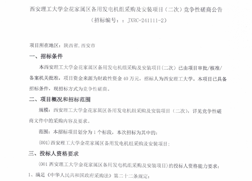【发电机二次】beat365正版唯一官网必一金花家属区备用发电机组采购及安装项目(二次)竞争性磋商公告