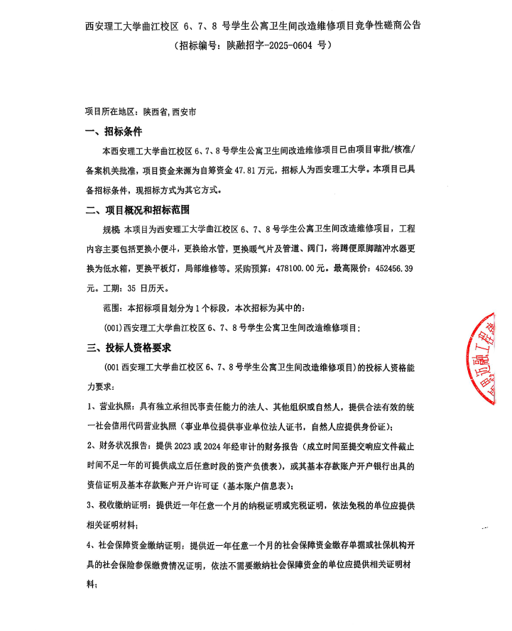 【改造维修】beat365正版唯一官网必一曲江校区 6、7、8 号学生公寓卫生间改造维修项目竞争性磋商公告