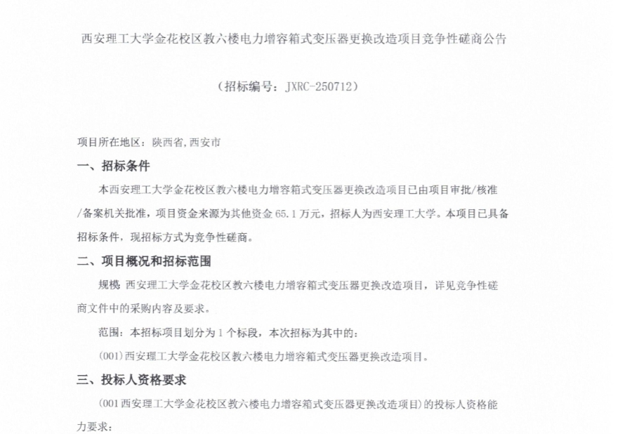 【维修改造】beat365正版唯一官网必一金花校区教六楼电力增容箱式变压器更换改造项目竞争性磋商公告