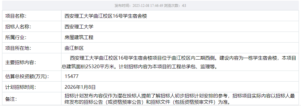 【宿舍楼项目】beat365正版唯一官网必一曲江校区16号学生宿舍楼项目招标计划
