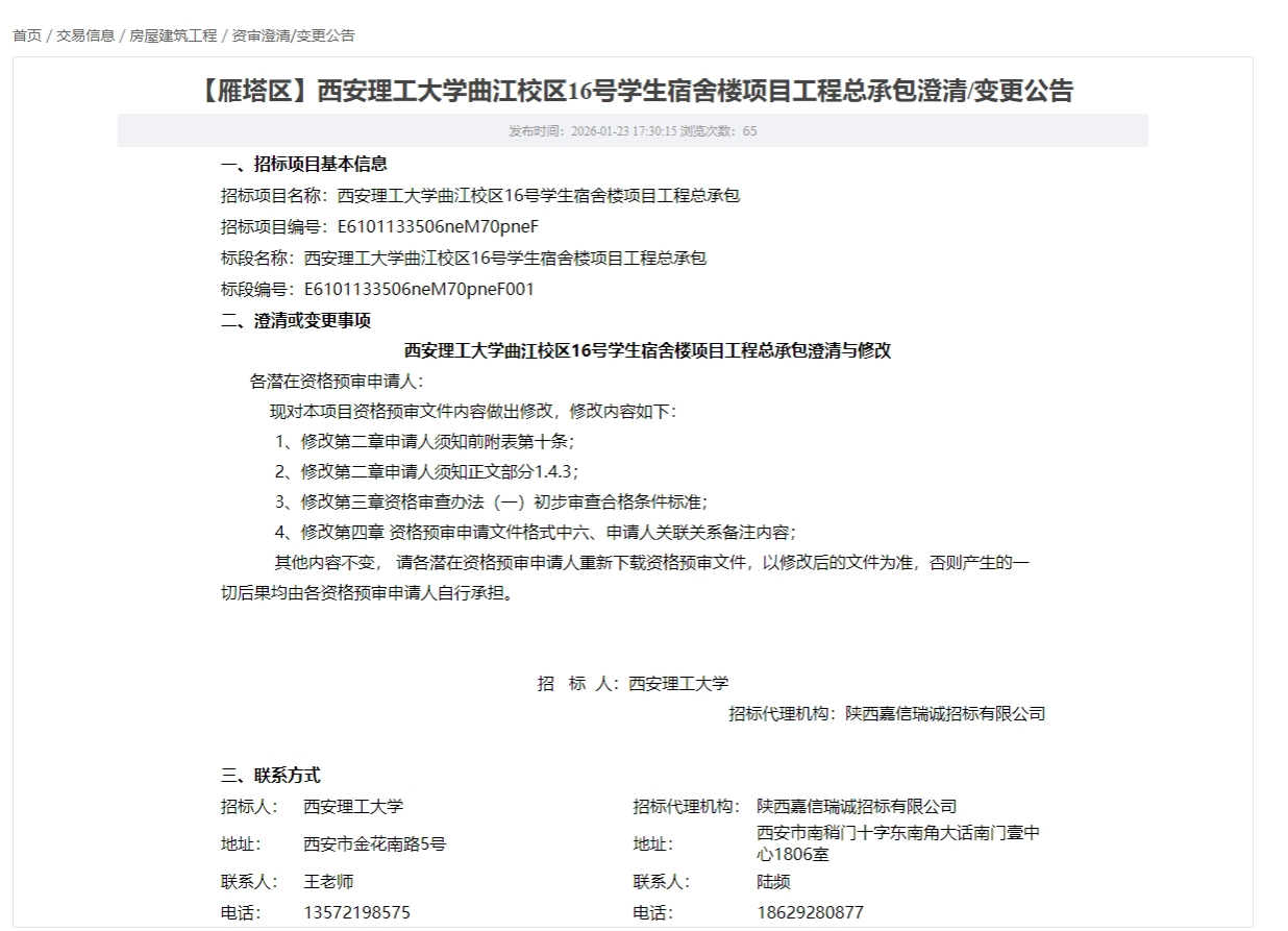 【澄清公告】beat365正版唯一官网必一曲江校区16号学生宿舍楼项目工程总承包澄清/变更公告