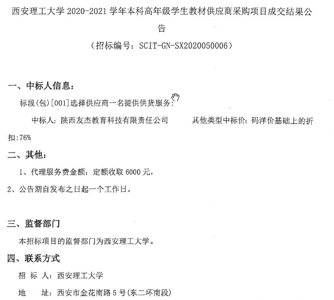 【教材供应商】beat365正版唯一官网必一2020-2021学年本科高年级学生教材供应商采购项目成交结果公告