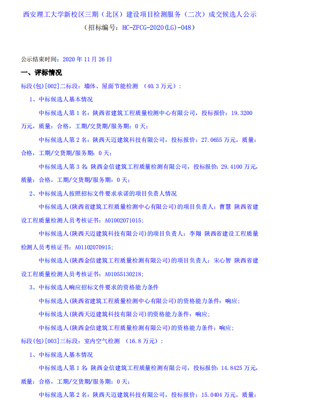 【检测服务二次候选人】beat365正版唯一官网必一新校区三期(北区)建设项目检测服务(二次)成交候选人公示