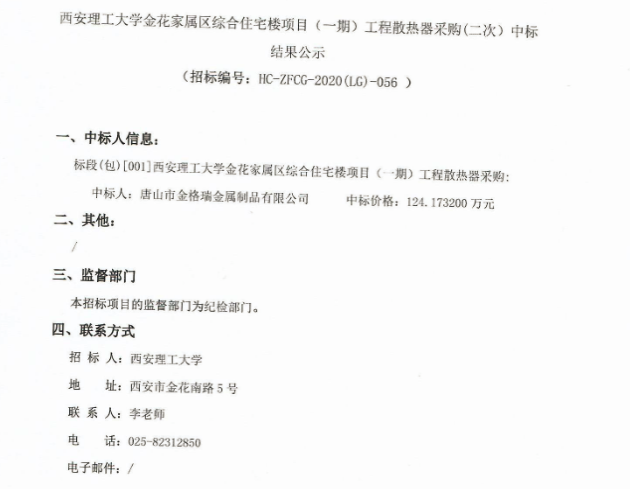 【工程散热器】beat365正版唯一官网必一金花家属区综合住宅楼项目(一期)工程散热器采购(二次)中标结果公示