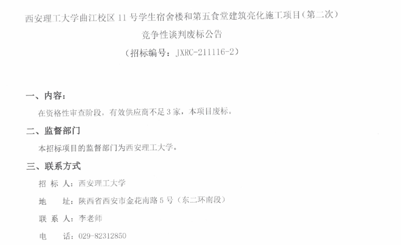【亮化工程】beat365正版唯一官网必一曲江校区11号学生宿舍楼和第五食堂建筑亮化施工项目(第二次)竞争性谈判废标公告