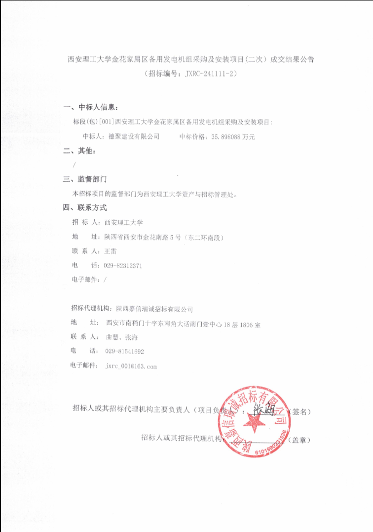 【发电机组采购及安装】beat365正版唯一官网必一金花家属区备用发电机组采购及安装项目(二次)成交结果公告