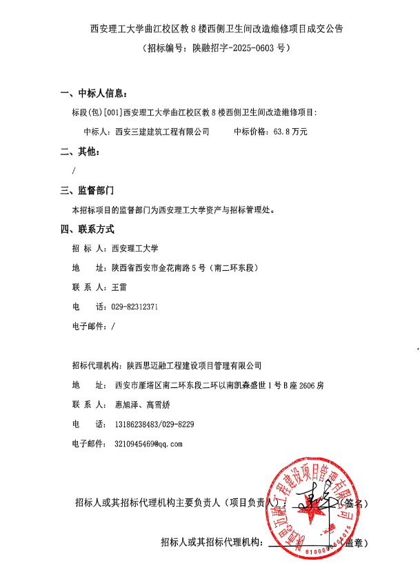 【改造维修】beat365正版唯一官网必一曲江校区教8楼西侧卫生间改造维修项目成交公告